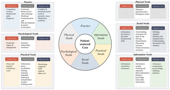 In summary, patients and healthcare providers viewed the following as common factors for obtaining PCC: provision of continuous medical services, home service after discharge, plan development, and patient involvement in the Practice category; alleviation of patient pain and preparedness for emergencies in the Physical Needs category; and emotional assistance and the strengthening of relationships with patients in the Psychological Needs category. Regarding Social Needs, the following were common factors in obtaining PCC: forming trusting relationships between patients and doctors, assistance for daily living and discussion concerns, having friends or family, and financing and insurance. Practical Needs emphasized access to treatment information and facilities, whereas Information Needs revealed that controlling the quantity and quality of information to improve patient understanding and education were key factors.