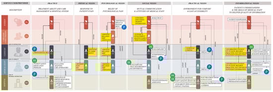 The provider of each factor and the service delivery flow were defined to structure the PCC delivery model based on Figure 2. This resulted in a service blueprint (structural system model), as shown in Figure 3. The blueprint introduced by Shostack [30] represents the interaction between service providers and users according to the journey stages. In this study, Shostack’s model was modified to suit our results. For each of the six PE categories, the roles of patients (service users) and healthcare providers (service providers) were diagrammed, as were the interactions between users. The vertical axis represents the stakeholders involved in PCC delivery and is divided into five user types: patients, caregivers, doctors, medical staff, and hospitals. The horizontal axis is divided into six PE categories. The PE factor for each category is linked to the service provider, and its location on the map is allotted considering the interaction between the users. The direction of service provision flow between each factor is indicated by arrows. The yellow box represents the PE factor provided to the patient directly, and the factors considered necessary by the patient and healthcare provider are marked separately as “P” in a blue circle and “H” in a green circle.