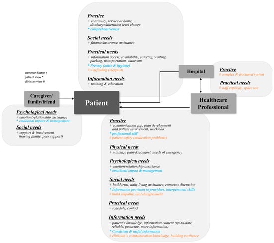 Looking at the differences between these two groups, in contrast to patients who highlighted the functional aspects directly related to treatment (provision of consistent and comprehensive services, emotional management, noise and hygiene control, and provision of their information to providers), healthcare providers focused on the relative importance of addressing structural problems (complex and fractured systems, staff capacity, limited space, and wayfinding) of the hospital system and the healthcare environment.