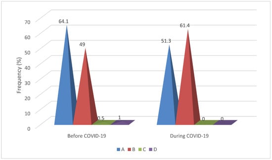 A shift in dominance becomes evident when examining variations among the distinct groups of CAAs. The proportion of patients with group A anomalies of origination and course was significantly higher before the COVID-19 period (64.1% versus 51.3%; p = 0.016), while the proportion of group B anomalies of intrinsic anatomy was significantly higher during the pandemic (49.0% versus 61.4%; p = 0.020). The small number of cases with group C (n = 1) or D (n = 2) anomalies recorded only before the COVID-19 period does not allow the application of statistical significance tests (Figure 1).