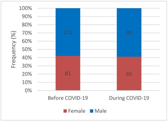 Gender distribution of coronary artery anomalies before and during the COVID-19 pandemic.