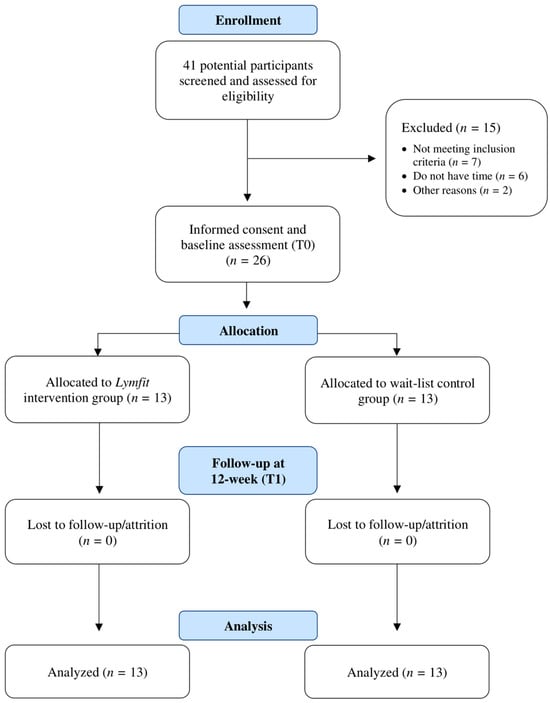 Future studies should consider employing a fully powered trial with a longitudinal design to assess the effectiveness of Lymfit over time. Such investigations can incorporate additional exploratory analyses to identify mediating and moderating factors for physical activities. Regression analyses can further elucidate specific factors, such as psychological needs or behavior regulation styles, that may predict the maintenance of physical activity levels and quality-of-life outcomes [64].
