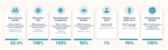 Figure 4. A priori feasibility benchmarks and results [35,42,43,44,46]. Note: a Data collected in the intervention group only (n = 13). b Data collected in the control group only (n = 13).