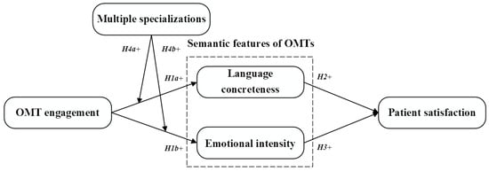This study explores the impact of OMTs’ engagement on patient satisfaction. Using the mediating role of language concreteness and emotional intensity, we constructed a research model (Figure 1). In the model, language concreteness and emotional intensity embody the semantic features of OMTs during OTCs. The moderating role of multiple specializations is also scrutinized in the model.