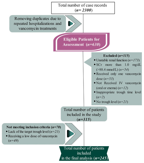 Initially, 2300 case records were collected. After removing duplicates due to repeated hospitalizations and vancomycin treatments, 630 patients were evaluated for eligibility according to the predefined criteria. Of these, 315 (50%) satisfied the inclusion criteria. The most common reasons for exclusion were patients with unstable renal function (n = 173), those receiving only one dose of vancomycin (n = 53), and those with SCr of more than 1 mg/dL (n = 54). Of the 315 included patients, 70 (22.2%) were excluded for not achieving the therapeutic trough level (n = 21) and receiving a suboptimal starting dose of less than 15 mg/kg/dose of vancomycin (n = 49). A total of 245 patients were included in the final analysis (Figure 1).