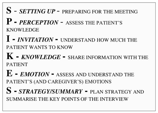 Moreover, presenting distressing information to patients and family members in an organized and appropriate manner is never simple. However, providers can refer to available guidelines, such as the SPIKES protocol, that could help them manage the relationship with the patients and their loved ones when negative or tough news is to be shared. SPIKES is an acronym for presenting distressing information to patients and families in an organized manner, and it provides suggestions that can help healthcare providers whether there is no access to the mediation of a psycho-oncologist [49].