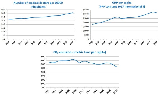 The biggest increases in average life expectancy in 2020 compared to 2000 were recorded by Estonia (11.6%), Latvia (6.9%), and Slovenia and Croatia, each with 6.8%. In the case of Estonia, the positive evolution of the average life expectancy is correlated with an important increase in health spending (57.6%), GDP per capita (102.0%), number of doctors per 10,000 inhabitants (31.3%), and a substantial reduction in CO2 emissions per capita (−50.1%). Furthermore, in Croatia, the increase in average life expectancy by 6.8% was accompanied by a 52.5% increase in health expenditure and a 54.6% increase in the number of doctors per 10,000 inhabitants, GDP per capita (47.0%) and with a small reduction in CO2 emissions per capita (−4.3%).