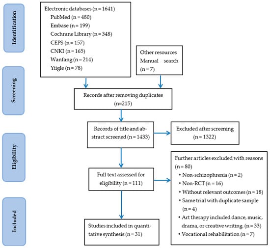 A total of 1641 records were identified across seven databases and manual searches. After removing 215 duplicate articles, we screened the titles and abstracts of 1433 articles. Of these, 1322 articles did not meet the inclusion criteria and were excluded. A full-text review was conducted on 111 articles, with 80 articles excluded based on the specified criteria. The reasons for exclusion and detailed information on the search results are summarized in Figure 1.