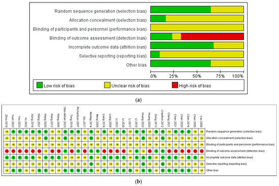 (a) Risk of bias graph. (b) Risk of bias summary for the included studies. Cao 2006 is the Ref. []; Chen 2005 is the Ref. []; Chen 2016 is the Ref. []; Chen 2020 is the Ref. []; Chen 2021 is the Ref. []; Cheng 2021 is the Ref. []; Crawford 2012 is the Ref. []; Dong 2013 is the Ref. []; Huang 2020 is the Ref. []; Huang 2022 is the Ref. []; Li 2010 is the Ref. []; Li 2017 is the Ref. []; Li 2020 is the Ref. []; Li 2022 is the Ref. []; Liang 2009 is the Ref. []; Liang 2016 is the Ref. []; Meng 2005 is the Ref. []; Montag 2014 is the Ref. []; Qiu 2017 is the Ref. []; Richardson 2007 is the Ref. []; Tong 2019 is the Ref. []; Utas-Akhan 2023 is the Ref. []; Wang 2005 is the Ref. []; Wang 2012 is the Ref. []; Wang 2020 is the Ref. []; Wang 2021 is the Ref. []; Xiong 2016 is the Ref. []; Xu 2022 is the Ref. []; You 2023 is the Ref. []; Yuan 2023 is the Ref. []; Zhou 2010 is the Ref. [].