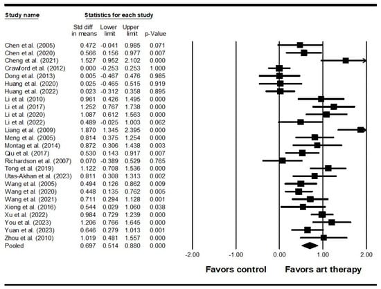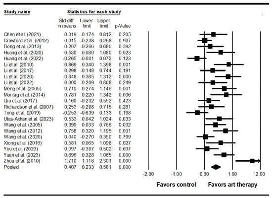The meta-analysis was conducted using the average change scores and standard deviations between the pre-test and post-test values []. Given the potential heterogeneity among various studies, a random effects model was employed to calculate the SMD and 95% confidence intervals (95% CI) for each outcome. The SMD is also known as Cohen’s d []. According to Cohen’s guidelines, effect sizes of 0.2 are considered small, 0.5 moderate, and 0.8 large []. Subgroup analyses were performed based on the different visual art therapy modalities employed (e.g., handcrafts, painting, calligraphy, etc.), publication years (within the last 10 years or over 10 years ago), and the continents where the studies were conducted. Meta-regressions were carried out based on participant characteristics, including age, gender ratio, duration of illness, and intervention characteristics, including weekly treatment time. Sensitivity analysis involved systematically excluding one study at a time to assess the impact of each included piece of literature on the meta-analysis results. The study utilized I2 for assessing heterogeneity, where I2 values of 25%, 50%, and 75% represented low, moderate, and high heterogeneity, respectively. Publication bias was assessed by visual inspection of the funnel plot and Egger’s test. In addition, we conducted a trim-and-fill method for the adjusted analysis. All statistical procedures were conducted using Comprehensive Meta-Analysis Version 4 software (Biostat Inc., Englewood, NJ, USA). This study is registered in the INPLASY (INPLASY202430021).