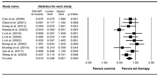 Forest plot of visual art therapy effects on depression in individuals with schizophrenia. Cao 2006 is the Ref. []; Chen 2021 is the Ref. []; Dong 2013 is the Ref. []; Huang 2022 is the Ref. []; Li 2010 is the Ref. []; Li 2020 is the Ref. []; Li 2022 is the Ref. []; Meng 2005 is the Ref. []; Montag 2014 is the Ref. []; Qiu 2017 is the Ref. []; Wang 2020 is the Ref. [].