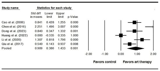 We found here that visual art therapy has a moderate effect size on depression (SMD = 0.610) and a high effect size on anxiety (SMD = 0.909) in patients with schizophrenia. According to our research, this study is the first integrated analysis of visual art therapy for the symptoms of depression and anxiety in schizophrenia patients, aligning with previous meta-analyses exploring the effects of art therapy on various populations []. Of note, a previous review indicated that art therapy may effectively alleviate anxiety in prisoners [], while a separate study demonstrated that art therapy can effectively reduce symptoms of anxiety and depression in cancer patients []. Visual art therapy, such as painting, has long been embraced across diverse social and cultural contexts, providing participants with a means to express their fears and worries through the process of artistic creation, thereby ameliorating depression and anxiety []. Similarly, our findings suggest that visual art therapy may serve as an effective adjunctive treatment option for individuals with schizophrenia when combined with antidepressants and mood stabilizers, warranting further investigation.