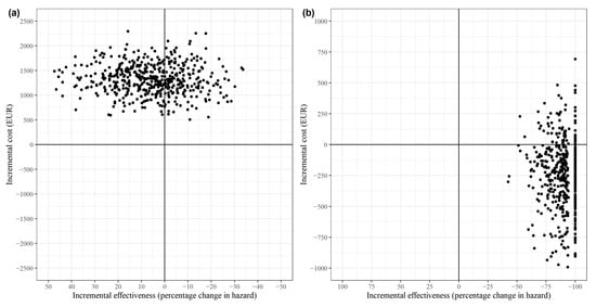 In order to consider model and parameter uncertainty, and thus the uncertainty of the individual estimates from the regression models, a probabilistic sensitivity analysis was performed using bootstrapping [41]. For this purpose, 500 new samples were generated by drawing with replacement. The samples were drawn in such a way that the new intervention and control groups always had exactly the same weighted sample size as the original study groups. For each of these samples, two regression models were run: one for costs and one for recurrence rates. This resulted in 500 pairs of data points (incremental cost in euros versus effect as a percentage change in hazards). The results were presented in a cost-effectiveness plane. For this, the x-axis was scaled inversely, as negative percentage changes in hazards represented a positive effect of the intervention. Afterward, different willingness-to-pay scenarios per percentage change in hazards were considered and visualized. Based on the 500 bootstrapping results, a cost-effectiveness plane was estimated, which maps the probability that the intervention is cost-effective for various willingness-to-pay assumptions [33,42].