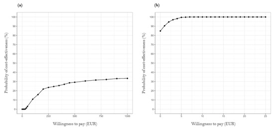 The cost-effectiveness acceptability curve illustrated in Figure 2a reveals that the intervention’s probability of cost-effectiveness for the total population remained low, even with a high willingness to pay, with a 1% probability at EUR 40. At a willingness to pay EUR 1000, the probability of the intervention being cost-effective was 33.4%. The curve flattened significantly beyond this point, indicating that an increase in the willingness to pay does not substantially enhance the probability of cost-effectiveness (see also Appendix B, Figure A1). This suggests that the intervention is unlikely to be considered cost-effective, even at higher willingness-to-pay levels. In contrast, the cost-effectiveness acceptability curve for TIA patients, presented in Figure 2b, shows that the probability of cost-effectiveness in this subgroup was at least 84.8% and reached 100% at a willingness to pay of just EUR 7 (see also Appendix C, Figure A2).