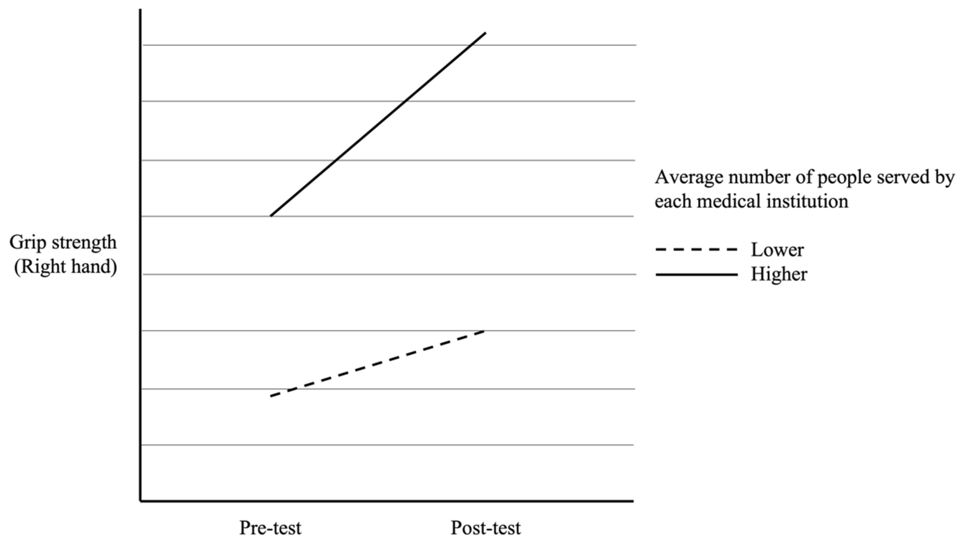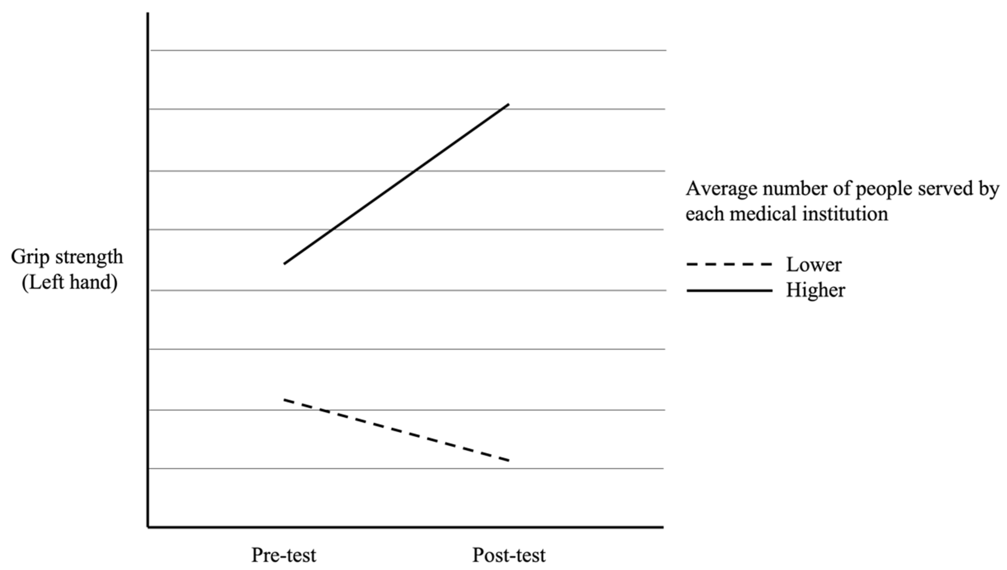 Higher average number of service population per medical institution | 99 | 21.92 (7.19) | 23.95 (6.55) | 20.51 (7.32) | 21.54 (6.62) | 20.52 (6.24) | 22.43 (6.02) | 4.70 (1.25) | 4.59 (1.25) |