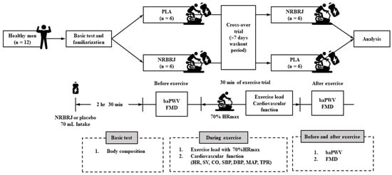 Therefore, this study aimed to examine the additive effects of NRBRJ supplementation and exercise on cardiovascular function in healthy men compared to effects from placebo (PLA) supplementation and exercise. The hypothesis of the present study was that NRBRJ supplementation and exercise may enhance cardiovascular function in healthy men compared with PLA supplementation and exercise.