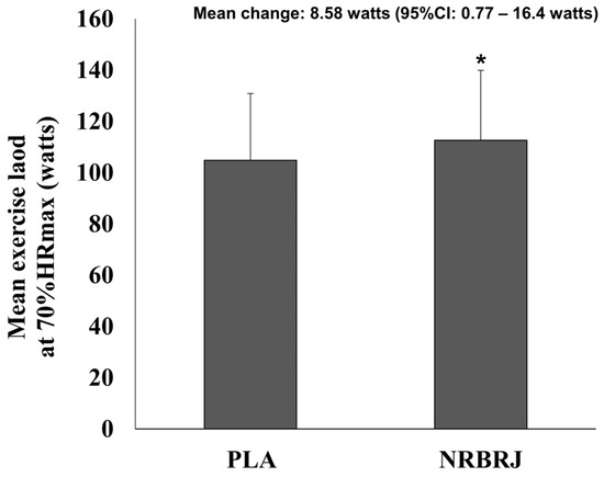 A significant difference was observed in the mean exercise load at 70% HRmax during the 30 min exercise between the two trials (Figure 3). The NRBRJ supplement demonstrated a greater increase in exercise load (mean change, 8.58 watts; 95% confidence interval, 0.77, 16.4; p < 0.05) than the PLA supplement.