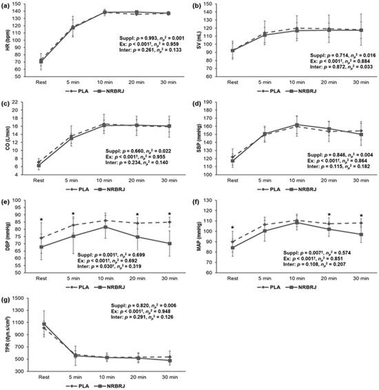 Figure 4 shows a significant interaction in DBP (p = 0.03, ηp2 = 0.319) and a significant main effect within each supplement in DBP (p = 0.001, ηp2 = 0.699) and MAP (p = 0.007, ηp2 = 0.574). In the post hoc analysis, the NRBRJ supplement significantly decreased DBP (p < 0.05) at rest and at 5, 20, and 30 min of exercise compared with the PLA supplement. Additionally, the nitrate supplement showed a significantly lower MAP (p < 0.05) than the PLA supplement at rest and after 20 and 30 min of exercise. However, no significant difference was found in HR, SV, CO, SBP, or TPR during the 30 min exercise at 70% HRmax between the PLA- and NRBRJ-supplemented groups.