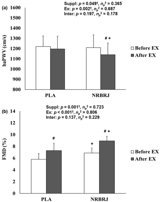 The baPWV and FMD before and after exercise between two trials. (a) Change in baPWV in each trial. (b) Change in FMD in each trial. NRBRJ: nitrate-rich beetroot juice; PLA: placebo; baPWV: brachial–ankle pulse wave velocity; FMD: flow-mediated dilation; Suppl: supplementation; Ex: exercise; Inter: interaction. † Significant interaction or main effect of supplement or exercise, † p < 0.05. # Significant difference between before and after exercise in each trial, # p < 0.05. * Significant difference between the placebo and NRBRJ supplement, * p < 0.05.