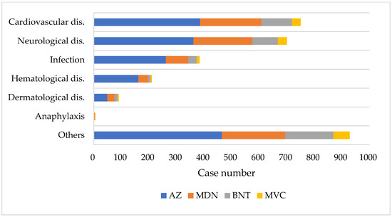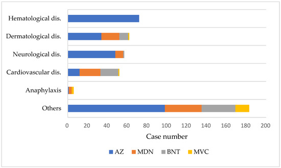 Among the associated/indeterminate group, hematological diseases were the most common diagnoses (75 cases, 17.2%), followed by dermatological diseases (62 cases, 14.3%), neurological diseases (57 cases, 13.1%), and cardiovascular diseases (52 cases, 12%) (Figure 3, Figures S3 and S4). All cases of hematological diseases were inoculated with the AZ vaccine, with 94.7% occurring after the first dose. Twenty-five cases of thrombosis with thrombocytopenia syndrome (TTS) were diagnosed, five of which resulted in death. The time intervals between vaccine administration and symptom onset were between 1 and 15 days in these five patients. Most dermatological cases (58, 93.5%) were diagnosed as urticaria. GBS was reported in 43 cases, with 36 cases occurring after the AZ vaccination and 7 after the MDN vaccination. Similarly, 35 cases of myocarditis/pericarditis were identified, with 15 occurring after the BNT vaccination, 12 after the MDN vaccination, and 8 after the AZ vaccination. Anaphylaxis occurred in six cases, including one case after AZ vaccination, three cases after MDN vaccination, and two cases after MVC vaccination.