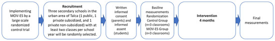 All schools in the city of Talca, Chile, are electronically randomized to select three high schools located in the urban area of Talca (1 public, 1 private subsidized, and 1 private unsubsidized). Each high school will have an EG (n = 30) and a CG (n = 30; no intervention). This selection approach is in line with the Chilean educational system, which associates school administration with the socioeconomic level of families.