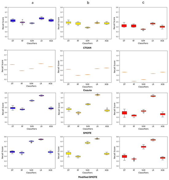 The overall recall score of different ML models after applying different augmentation techniques on target features: (a) suicide ideation; (b) suicide planning; and (c) suicide attempt.