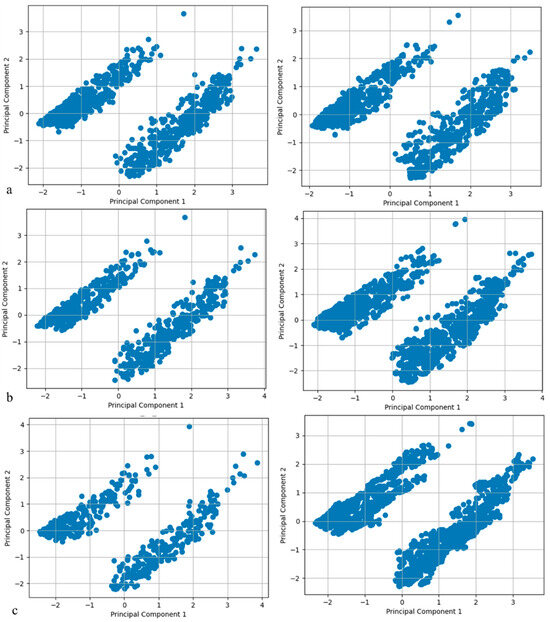 Comparison between the real ((left) side) and synthetic data ((right) side) considering the first two components of PCA: (a) suicide ideation; (b) suicide planning; and (c) suicide attempt.