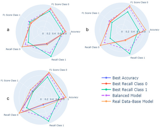Following the parameter tuning process, a total of 50 distinct models were developed for each target variable. The selection of the optimal model for the purposes of this study was based on a comprehensive evaluation of its performance, focusing not only on high accuracy but also on strong recall and F1 score values, particularly for class 1, which is crucial in the context of suicide prediction. To facilitate the selection of the most suitable model, Figure 4 in the study displays a radar chart that compares five different models. These models include the one with the highest accuracy, the model with the highest recall for class 1, the model with the highest recall for class 0, the base model that was trained using real data, and the balanced model, which is identified as the best in this context. The term ‘balanced’ in this case refers to the model that achieves satisfactory scores across all evaluation metrics, indicating its versatility and reliability. [See Supplementary Materials Section S4 for more information about the models].