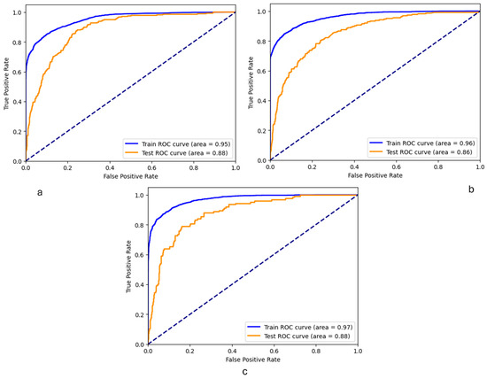 ROC curves of the training and testing of the LR models for (a) suicide ideation; (b) suicide planning; and (c) suicide attempt.
