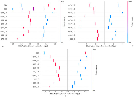 Figure 6 shows a SHAP summary plot that displays the impact of the top 10 features on the model output. In this Figure, the X–axis (SHAP value) represents the impact of a feature on the model output. A feature with a SHAP value of zero would indicate no impact on the model’s output, whereas a feature with a higher absolute value (positive or negative) has a greater impact. The Y–axis (Features) lists the features used in the model, and the color represents the value of the features, where one side of the color spectrum (blue) shows a low feature value, and the other side (red) shows a high feature value. In Figure 6a, features such as Q26 (indicative of sad feelings and hopelessness) and Q88 (representing mental health status during COVID-19) demonstrate that high values are associated with an increased likelihood of suicide ideation, as reflected by their positive SHAP values. Conversely, Q70_4.0, a feature indicating individuals who are not preoccupied with weight control or do not have a weight loss plan, shows negative SHAP values. This suggests that not being focused on weight control is associated with a decreased likelihood of suicide ideation. Figure 6b displays a broader range of SHAP values compared to (a), indicating that the features have a more substantial impact on the model’s output for suicide planning. High values in features such as Q90_1.0 (denoting unemployment before COVID-19) and Q70_1.0 (representing individuals actively trying to lose weight) significantly increase the likelihood of suicide planning. On the other hand, a feature like Q40_1.0, which indicates non-use of tobacco in the last 12 months, has low values that significantly reduce the likelihood of suicide planning. In Figure 6c, the influence of different features on the likelihood of a suicide attempt varies. Notably, Q26 remains a consistent and significant feature across all models, highlighting its importance in the context of suicide behaviors. Also, Q67, which pertains to sexual behavior, is identified as having a substantial impact. Additional features like Q59 (relating to being offered or sold drugs in school) and Q5 (indicating race) also emerge as important factors in a suicide attempt. The presence of Q26 across all models underlines the strong link between feelings of sadness and hopelessness, and the risk of suicide ideation, planning, and attempts. The inclusion of factors like mental health during COVID-19, weight management plans, employment status, tobacco use, drug exposure, and racial background illustrates the multifaceted nature of suicide risk factors.