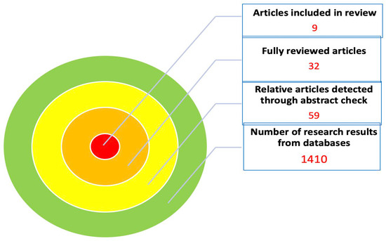 A total of 1410 articles were obtained from the search among all databases. A detailed presentation of the number of publications from each database is presented in Table 1. After the initial screening, 59 articles were relevant to the topic of the review. After a review of the abstracts, we detected 32 articles with high relevance, which were fully reviewed. Among these, seven studies were finally identified as eligible for inclusion in the review, while two more studies were found through the author’s secondary search of the references of the included manuscripts (Table 1) [2,5,6,7,8,9,10,11,12]. Additionally, studies with non-randomized and comparative data were evaluated for their quality with the Newcastle—Ottawa Scale [13]. The outcomes of article evaluation are presented in Table 2 according to the aforementioned scale (Table 2). Out of five studies in total, two were categorized as medium-quality studies (four and six stars) and three as high-quality studies (seven stars for each study). Consequently, the number of publications included in the review was nine and the flow chart is depicted in Figure 1.