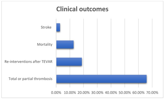 Evidence on reinterventions after TEVAR was also included in the majority of the studies (five studies out of nine). The reintervention rate was 18.7% (14 cases out of 75) (Figure 2). It is worth mentioning that two patients were submitted to open surgery, one patient was treated with left subclavian artery occlusion with coils due to retrograde perfusion and the rest were treated with endovascular repair (Table 5).