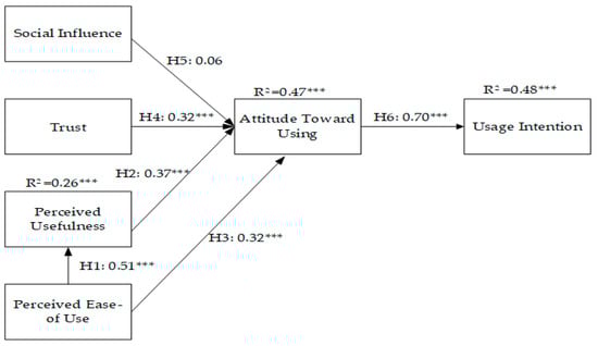 H1–H4 and H6 were supported, but not H5. Figure 2 displays the explanatory power of each endogenous latent variable of the research model to the overall model. The path values between each dimension adopted standardized coefficients. The variation explanatory power (R2) of each endogenous latent variable in the research model to the overall model is as follows: the R2 of perceived ease of use to perceived usefulness was 26% (0.26); the R2 of perceived usefulness, social influence, trust, and attitude toward using was 47% (0.47); and the R2 of attitude toward using and usage intention was 48% (0.48).