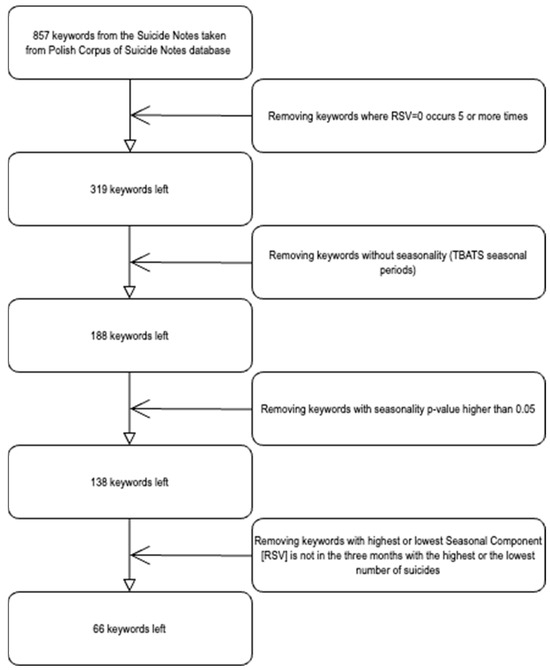 Data collection took place in December 2021, with each keyword entered individually into Google Trends. Each word from the database of suicide notes was individually entered into Google Trends (https://trends.google.com/trends/, accessed on 10 December 2021.) with set parameters (time: January 2010 to December 2020, location: Poland). The data were downloaded in CSV format for analysis. Each keyword was searched and retrieved individually. All collected data were meticulously compiled and organized in an Excel spreadsheet. From the initial pool of 857 time series, authors excluded 791, ultimately selecting 66 keywords for our analysis. A detailed diagram of the word selection process is presented in Figure 1.