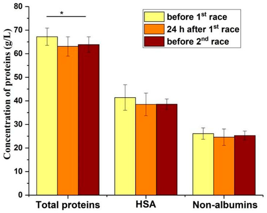 To confirm that two intensive Pas, with a short period of time in between, can affect the levels of serum protein fractions due to proteinuria, their levels were plotted 24 h and 7 days after the first race, regardless of treatment (Figure 2). It seems that the 7-day period between two races was not sufficient for the complete recovery of total proteins, as the mean concentration values of total proteins, HSA and non-albumin proteins before the 2nd race were 3.3 (p < 0.01), 2.5 and 0.8 g/L lower than the mean values before the 1st race, respectively. It can also be seen that the mean values of HSA and non-albumin proteins were at the same level 24 h and 7 days after the first race. This indicates that proteinuria influences the values of both fractions.