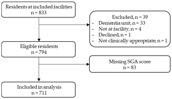 There were 833 residents listed at the 10 participating RAC facilities. Of these, 39 were ineligible for the following reasons: 33 were residing in memory support units or designated dementia units, 4 were not present at the facility, 1 declined participation, and 1 was deemed clinically inappropriate by the facility clinical nurse. A further 83 records were excluded due to missing SGA scores. A total of 711 residents were included in the final analysis (Figure 1). Residents had a mean (SD) age of 84 (8.36) years, were predominantly female (63%), and had a mean (SD) BMI of 26.74 (6.59) kg/m2. The 83 records excluded due to missing SGA scores are likely to be similar to the included participants, with a mean age of 82 years and mean BMI of 26.52 kg/m2.