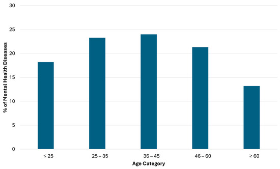 Figure 1 presents the distribution of mental health disease by age category. The figure suggests that mental health disease was disproportionately less prevalent in those in the youngest and oldest age groups, and manifested much more frequently in the middle age groups (those aged 24–35 or 36–45 years). In the conditional logistic regression analysis conducted to identify factors associated with the likelihood of being diagnosed with a mental illness, only sex, BMI, diabetes, stroke, and asthma/obstructive pulmonary disease variables were statistically significant in the univariate analysis (Table 2). However, this significant association was consistent in the final multivariable model, in which a significantly increased likelihood of mental health disease was observed in females (OR = 2.12, 95% CI: 1.77–2.55, p < 0.0001), patients with diabetes (OR = 1.98, 95% CI: 1.34–2.92, p = 0.001), and stroke (OR = 4.59, 95% CI: 2.07–10.19, p < 0.0001). Those with asthma/obstructive pulmonary disease had a significantly reduced likelihood of being diagnosed with a mental health disease (OR = 0.45, 95% CI: 0.25–0.79, p = 0.005). Further, increased BMI was associated with a marked significant increase in the likelihood of being diagnosed with a mental health disease (OR = 1.02, 95% CI: 1.01–1.04, p = 0.001).