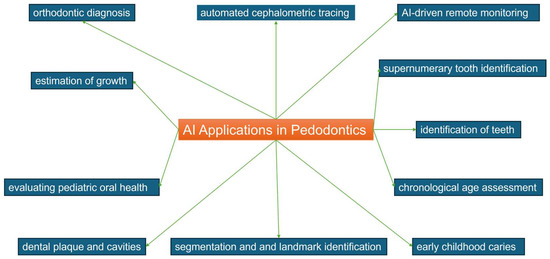 The integration of AI technology into dental practices holds the potential to elevate the standard of dental treatment significantly. By providing support to dentists, AI facilitates optimal dental care, leading to enhanced accuracy in diagnostics, treatment planning, and outcome predictions. Notably, deep learning plays a pivotal role in diagnosis, promising increased productivity, and improved precision across dental procedures. The advent of readily available data has allowed AI to demonstrate its efficacy in various pediatric dentistry applications, with Convolutional Neural Network (CNN) models proving particularly effective in expediting and refining patient diagnoses. This collaborative approach encourages active patient engagement, thereby contributing to the overall success rate of dental care [19,81,82,83]. Figure 2 explores the field of the application of AI in pedodontics.