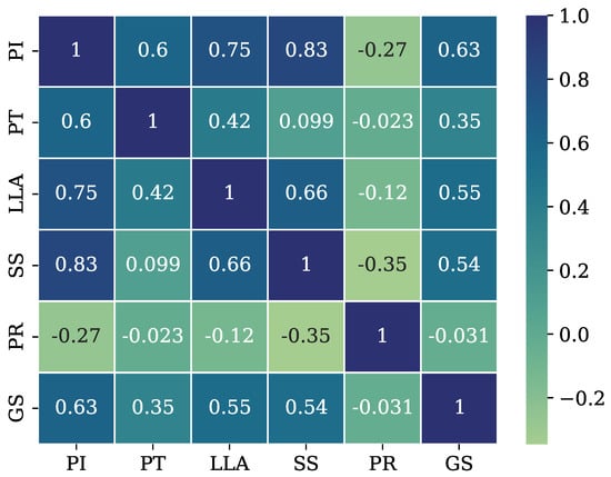 This dataset imbalance can decrease the classifiers’ potential due to insufficient elements for a representative and fair classification. So, the dataset is corrected through the Adaptive Synthetic Sampling Approach for Imbalanced Learning (ADASYN), which randomly creates additional samples for the minority classes [54,55] (oversampling correction strategy). The technique is employed to generate synthetic samples to achieve 150 elements for each class. This technique is used over other popular approaches, such as the Synthetic Minority Oversampling Technique (SMOTE), since ADASYN can create samples with more defined decision boundaries and is less susceptible to the noise produced by outliers [56]. Figure 1 displays the heat map illustrating the correlation among the attributes of the oversampled dataset. The depicted matrix displays the correlations between the attributes in the row labels and attributes in the column headers. A negative cell value indicates a negative correlation (inverse relationship), while a positive value expresses a positive correlation (direct relationship). A lower magnitude value in a cell represents independence between the correlated attributes, and a greater magnitude value means dependency between them. It is observed that the PR attribute has the lowest correlation magnitudes (the more independent attribute), while the PI attribute has the greatest correlation magnitudes (the more dependent attribute). Typically, strategies to boost the performance of a particular classifier (depending on the attributes’ correlations) can be implemented to reduce the dataset size by eliminating an attribute to reduce the computational load [57]. Nevertheless, given the limited size of this dataset, there may not be an enhancement in the computational load, and the performance can be affected [58]. Therefore, all the attributes are to be employed in the classification processes.