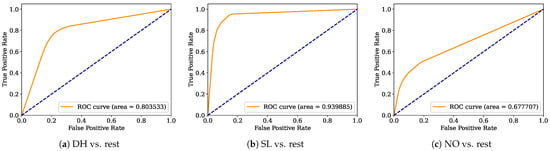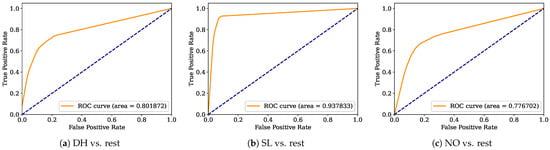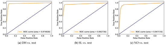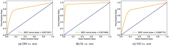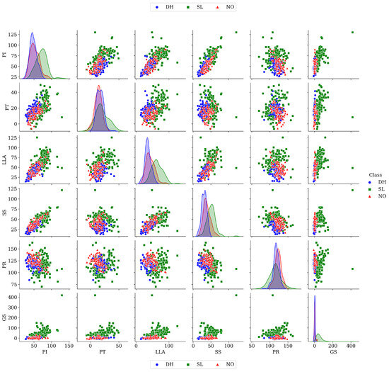 Looking for a complete analysis of the employed dataset, the principal component analysis (PCA) matrix in a pairwise comparison among the attributes is presented in Figure 2. The distribution of the elements according to just one attribute is offered in the diagonal of this matrix, where the distributions of the DH, SL, and NO classes are depicted in blue, green, and red, respectively. It is observed that, for elements of the SL class, the attributes PI, LLA, SS, and GS have important differences against those of the other two classes (DH and NO). On the other hand, only the attributes LLA, SS, and PR have slight differences in the distributions of the DH and NO classes. Furthermore, the rest of the matrix of pairwise comparisons provided in Figure 2 shows the distribution of scattered elements of the three classes in each plane created between the considered attributes. The DH, SL, and NO classes are depicted in blue circles, green squares, and red triangles, respectively. Within these planes, it is observed that a high correlation exists between the elements of each class since the elements of the classes overlap. Moreover, the scattered elements of all the classes tend towards a linear behavior in those planes that use one of their axis components, the GS and PI attributes. This information could prove valuable in determining the key attributes to consider.