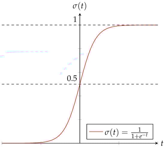 Despite its name suggesting a regression process, this technique is used as a classifier. The LR classifier implements a similar process to linear regression, where there is a weighted sum of the attributes plus a bias term. The vector form of the operation is defined as , where is an element of the dataset and is the vector that includes the bias value and the weights of each attribute. The manner that LR performs classification tasks is through the implementation of a logical binary state function (5), where , is a Sigmoid function (see Figure 3) and is the binary state of probability of an element to be included within a class [64]. Since the logistic functions mainly rely on the values of the bias and weights parameters, an optimization problem is solved in a training stage by minimizing a logistic regression cost function (6).