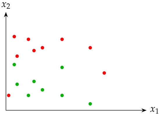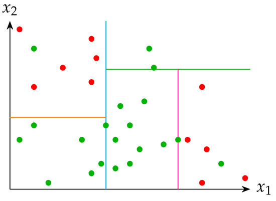 In contrast to the previous methods, this strategy relies on logical reasoning rather than a mathematical foundation. Visually, the DT method can bear a resemblance to the SVM approach. However, instead of employing a hyperplane, DT utilizes orthogonal divisions based on the datasets’ attributes [69]. Figure 6 depicts a fundamental illustration of how the method divides the elements of two classes (red dots and green dots). The elements possess two attributes, denoted as and . This method aims to identify the values (within the range of the attributes) that divide the elements into two groups, each consisting of components belonging to just one class. Supposing the new groups fail to meet the specified criteria, the procedure will be iterated, creating a hierarchical structure of conditional functions known as a Tree. This approach relies upon several elements, including