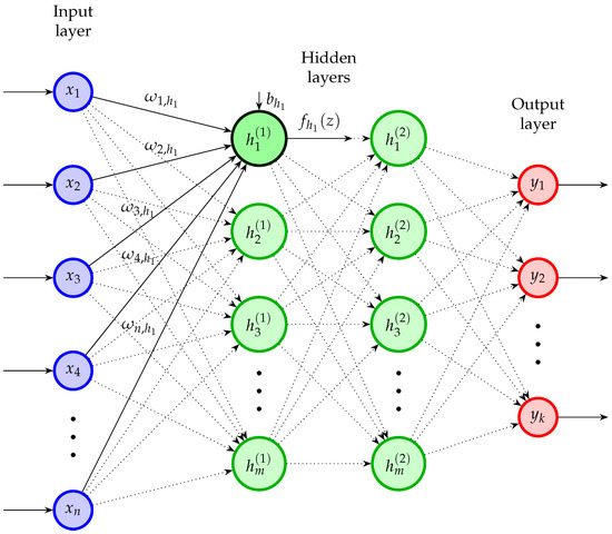 This classifier utilizes a concatenation of individual neurons, resembling the network depicted in Figure 5. Notably, the ANN architecture employed in this paper is a feed-forward topology with hidden layers. Every neuron adheres to two fundamental processes [68]. The first hidden layer’s first neuron is analyzed to present an example. The first process is to solve (8) by computing the sum of the products of each input with its corresponding weight that are connected to the neuron , and then adding the bias of the neuron. Subsequently, the outcome from the preceding phase is employed in an activation function (Table 3 displays popular activation functions), with the resulting output serving as the input for the subsequent neurons in the next hidden layer or as the ultimate result in the output layer. All the neurons of the network execute these two processes. At the training stage, an optimization problem is formulated to determine the optimal weights and biases of the neurons to enhance the neural network performance. The use of an optimization problem in the ANN makes it one of the most precise and dependable classifiers. However, it is essential to note that the training step is somewhat slower than alternative approaches. Additionally, it is crucial to note that the ANN approach relies on other hyperparameters like the learning rate (step size of the optimization algorithm) and the dimension/structure of the hidden layers. Another crucial factor affecting an ANN’s behavior is related to its solver algorithm (optimization algorithm), which computes the ANN’s weights and biases. Some popular optimization algorithms are the stochastic gradient descent (sgd), lbfgs, and the adaptive moment estimation (adam) algorithms.