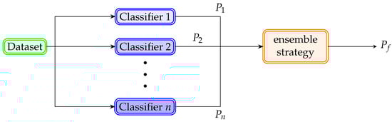 Since the individual classifiers work through different approaches, their results may vary in their accuracy [71]. In some practices, a classifier might better classify particular elements, while another classifier might be more accurate with different ones. Therefore, a strategy to enhance the classification process is to ensemble multiple pattern recognition techniques [72,73]. Figure 7 displays an example of n classifiers gathered to find a final forecast by evaluating their n individual predictions through an ensemble strategy.