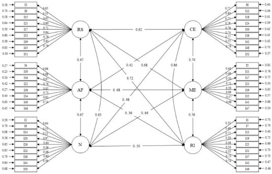 Because the model presented has latent or unobserved variables, it is necessary to identify each of them with a statistical value to calculate estimates of their effects. The estimated values evaluate a parameter that characterizes the population through a sample []. The goodness-of-fit criteria of the model in this study were evaluated from two perspectives: absolute fit and incremental fit. The reported absolute goodness of fit was significant (χ2 = 7168.98; gl = 1268; p < 0.001; RMSEA = 0.08), thus establishing that the relationships between the constructs and hypotheses have significance. The incremental model fit measures allowed for comparing the proposed model with the existing model; the AGFI and NFI were >0.09 on the global scale and on the six dimensions. The AGFI with values close to ≥0.90 shows a better fit of the Martinez model []. The NFI is considered an acceptable value if it is >0.90.