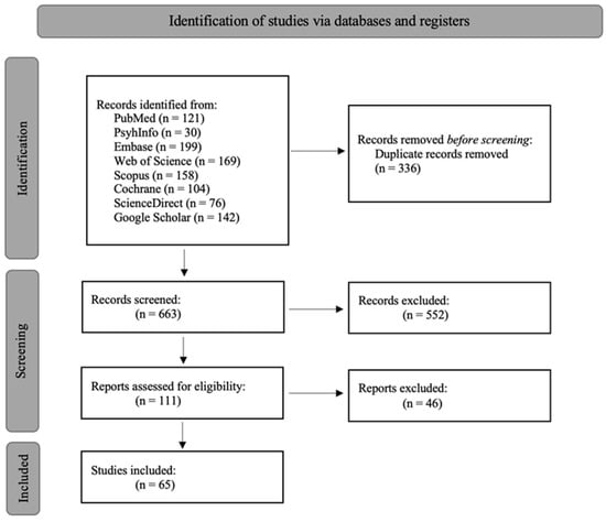 The search results were screened for eligibility based on predefined inclusion and exclusion criteria. Studies were included if they reported data on the prevalence of BDD among patients with cosmetic or reconstructive plastic surgery, including papers within specialties of dermatology, oral-maxillofacial surgery (OMFS), and otolaryngology (ENT) who perform similar procedures. Exclusion criteria included cases unrelated to the topic, studies with small sample sizes (<20 participants), studies lacking clear diagnostic criteria for BDD, studies with incomplete or missing data, and studies inaccessible in English. In the initial search, 999 articles were identified, of which 336 were duplicates and were removed. A total of 663 were screened by title and abstract, of which 111 were sought for retrieval and entered the qualitative third-phase assessment. Sixty-five records published between 1998 and 2024 were included in the final analysis (Figure 1).