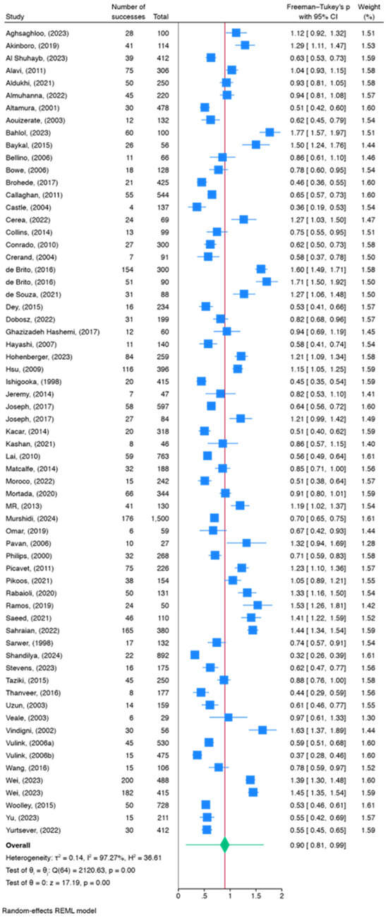 Sensitivity analysis was conducted to assess the impact of different fixed values for tau (0.75, 0.50, and 0.25) on between-study variance and heterogeneity in the analysis. When tau was fixed at 0.75, a high level of between-study variance (tau2 = 0.75) and significant heterogeneity (I2 = 99.49%, H2 = 196.10) were observed. The effect across studies remained statistically significant (p < 0.0001), however. Fixing tau at 0.50 resulted in decreased between-study variance (tau2 = 0.50) and reduced heterogeneity (I2 = 99.24%, H2 = 131.07), while the effect remained significant (p < 0.0001). Finally, fixing tau at 0.25 further reduced between-study variance (tau2 = 0.25) and led to decreased heterogeneity (I2 = 98.49%, H2 = 66.03), indicating a trend towards homogeneity. Additionally, proportions of total variance and prediction intervals remained relatively stable, suggesting increased precision in predicting the true effect size in future studies.