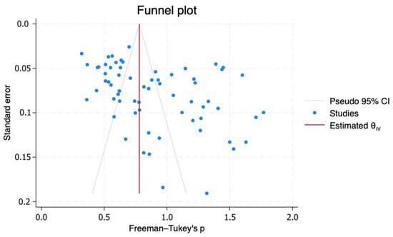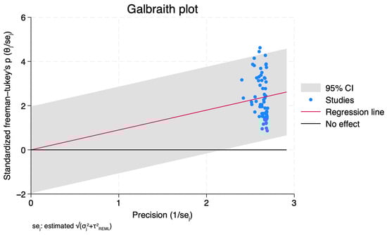 The test of homogeneity indicated significant heterogeneity across studies (Q = χ2 (64) = 2120.63, <0.0001), supporting the utilization of a random-effects model. The estimated tau2 of 0.1369 indicates variability beyond chance. The I2 statistic, representing the percentage of total variation across studies due to heterogeneity, was calculated to be 97.27%, further indicating high heterogeneity, also demonstrated by the Galbraith Plot (Figure 3). The 95% prediction interval for the true underlying effect size (invftukey (θ)) was estimated to be [0.153, 1.644]. The test of θ = 0 yielded a statistically significant result (t (65) = 17.18, p < 0.0001), suggesting the observed effect size is unlikely to be due to chance alone.