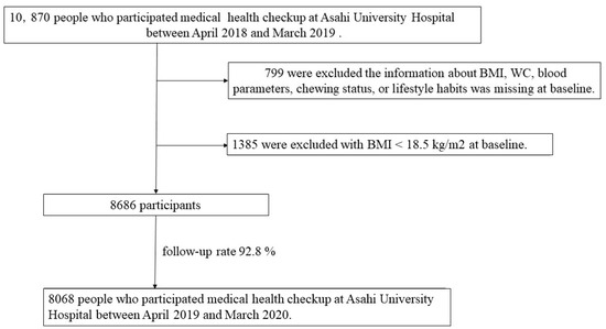All study participants received a specific health checkup at Asahi University Hospital Human Health Center between April 2018 and March 2019 (baseline). A total of 10,870 people were recruited, of whom, 799 were excluded because information on body mass index (BMI), WC, blood parameters, chewing status, or lifestyle habits was missing at baseline or after the 1-year follow-up visit. In addition, because people with BMI < 18.5 kg/m2 are defined as “under-weight” [18,19], and these individuals would not be considered unhealthy if their WC increased in the future, 1385 participants with BMI < 18.5 kg/m2 were excluded [20,21]. Accordingly, 8068 participants (5138 males and 2973 females; mean age, 51.0 years) were included in the final analysis between April 2019 and March 2020 (follow-up rate: 92.8%) (Figure 1). This study was approved by the Ethics Committee of Asahi University (No. 30018; approved 2018) and performed in accordance with the Declaration of Helsinki. All participants provided informed consent. This study followed the STROBE guidelines.