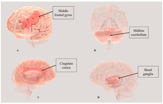 Reports on the most prevalent brain areas activated after OMT according to the included studies. Created using BrainFacts. Legend: (A) middle frontal gyrus; (B) midline cerebellum; (C) cingulate cortex; and (D) basal ganglia. Supporting evidence: (A) [27,30]; (B) [27]; (C) [26,27,28,30]; and (D) [27].